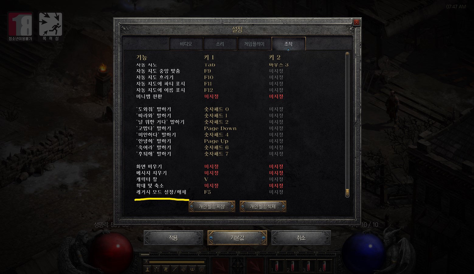 레거시 모드로 바꾸는 방법은 ESC키를 눌러 설정에 들어간 다음 조작탭에서 맨밑으로 스크롤을 내리면 레거시 모드 설정/해제 단축키 버튼이 나와있다. 그 단축키를 누르면 레거시 모드를 설정/해제할 수 있다.