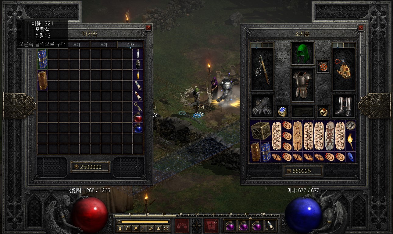 마을에서 아카라에게 마을 차원문의 고서(파란색 책)를 1개 구입한다.