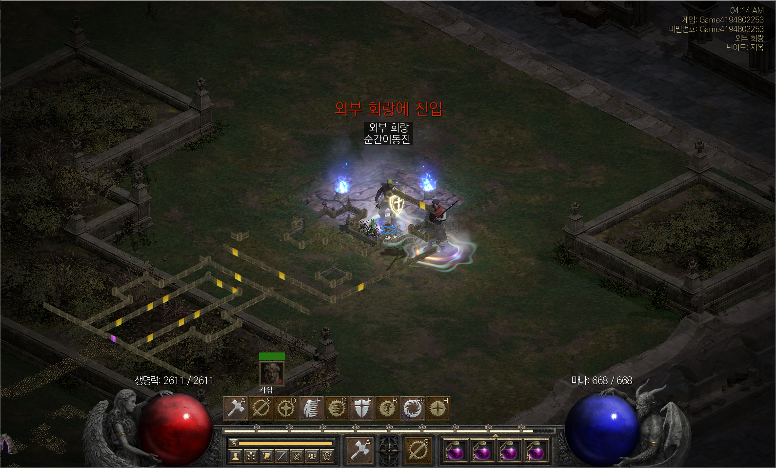 1. 순간이동진를 타고 외부 회랑으로 이동한다. 참고로 아래 미니맵에 보이는 외부 회랑과 정문의 기본적인 구조는 고정이기때문에 구덩이(피트)로 가기 위해서는 항상 순간이동진에서 7시 방향의 수도원 정문 입구로 이동하면 된다.